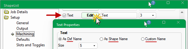 The Text checkbox for both Standard and Multi Shapes allows you to turn on/off the name of the part being displayed in the preview pane and editor modes, and/or machined onto the part. It can also be customised.