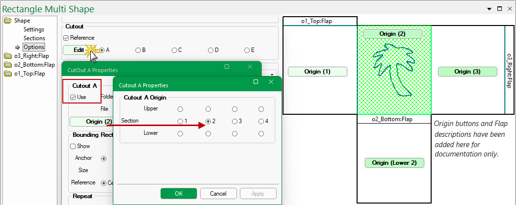 For Multi Shapes, Origin buttons are used to designate where section features, such as DXF Cutouts and Custom Cutouts, are placed.