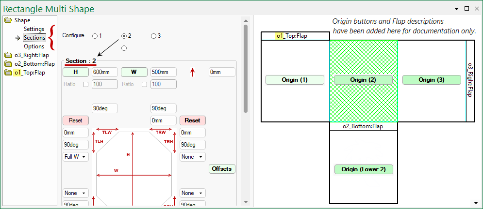 When Flaps are added, pages are added with a prefix that defines which section is being configured e.g. the page o1_Top:Flap uses the prefix o1 to define that this is the flap that is attached to Origin 1, as illustrated in the preview pane below.