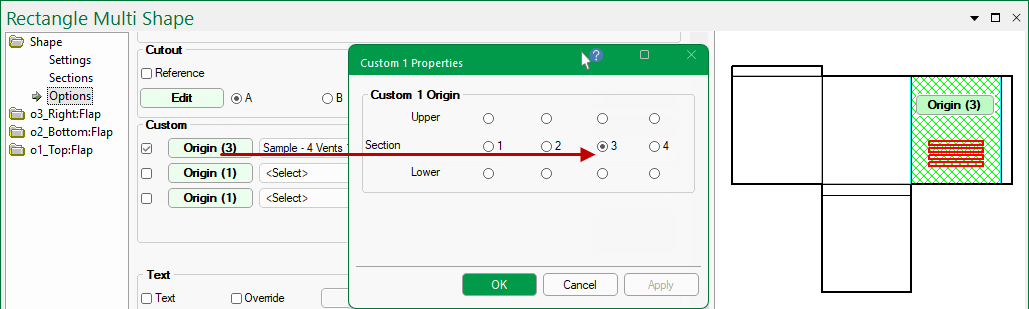 Custom Cutouts can be placed on a designated section by using the Origin button on the Custom Properties dialog.