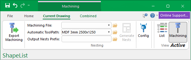 Machining changes the display mode of the active pane to allow selection of Machining options, integrating EzyNest directly into CabMasterPro.
