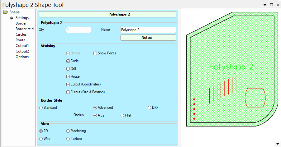 This part lets you create an asymmetric border, or import a DXF as a border, add in slots, holes, routes and cutouts as required. This part will let you create a completely different type of shape with ShapeMaster.